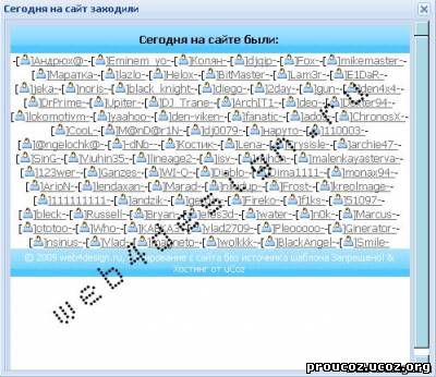 | И так начнем: 1. Создадми страницу, в которой прописываем код информера (страница не должна долго грузиться, лучше убрать графику по максимуму). 2. Вам нужно создать в любом текстовом редакторе, потдерживающем кодировку Utf-8, документ xml. В нем пишем: Code <ajax><cmd t="layerContentBs" p="innerHTML"><![CDATA[<iframe style="width:100%;height:400px" frameborder="0" scrolling="no" hspace="0" vspace="0" allowtransparency="true" src="ссылка на страницу с информером"></iframe>]]></cmd></ajax> Сохраняем. 3. На своем сайте в нужном вам месте вставляем код: Code <a href="javascript://" onclick="openLayerB('Bs',0,'Ссылка до xml файла','Название окна',200,100,'1','','',0,'justify'); return false;">Просмотреть список пользователей, побывавших сегодня на сайте.</a> Готово! Quote Внимание, то что обозначено: Красным цветом - Менять обязательно Синим цветом - По усматрению Зеленым - разрешение ajax окна.