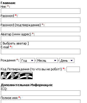 $LOGIN_SIGN$ $LOGIN_FL$<br><b><font color="#ff0000">(логины типа: 123, AdminLox Будут удаляться!)</font></b><br> $PASSWORD_SIGN$ $PASSWORD_FL$ $PASSWORD1_SIGN$ $PASSWORD1_FL$ $AVATAR_SIGN$<br> $AVATAR_FL$<br> $EMAIL_SIGN$ $EMAIL_FL$<br><br>$BIRTHDAY_SIGN$ $BIRTHDAY_FL$<br><br> $SECURITY_CODE_SIGN$ $SECURITY_CODE_FL$<br><br><b>Дополнительная Информация:</b><br>$ICQ_SIGN$ $ICQ_FL$ <br>
